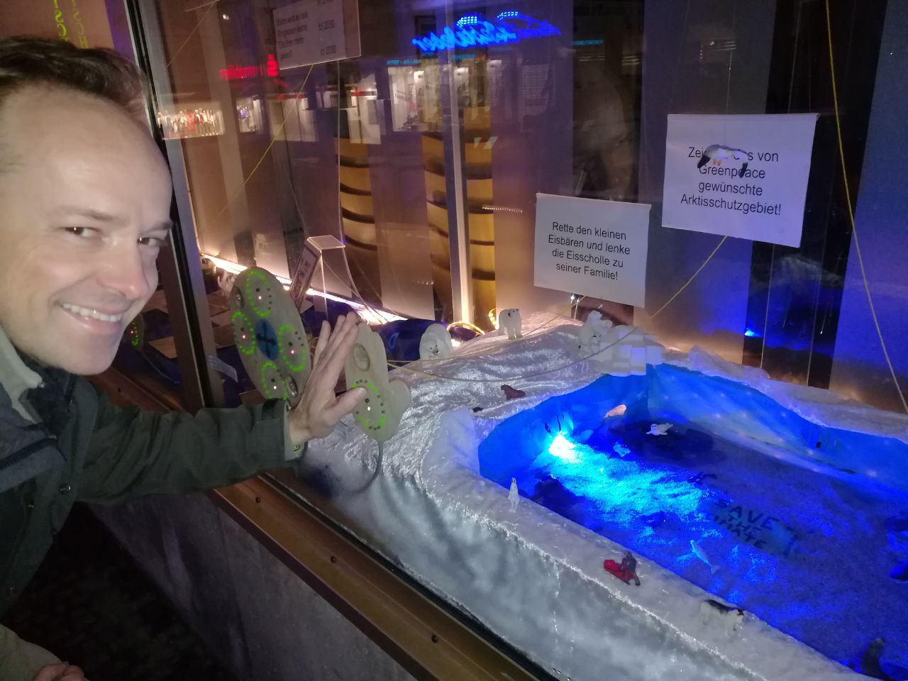 Ab sofort sind alle herzlich dazu eingeladen, aktiv mitzumachen. Seit Monaten bohrt, sägt, hämmert, lötet und programmiert die Gruppe bereits an der Schaufenstergestaltung und das hat sich zweifellos gelohnt, denn jeder, der vor dem Schaufenster steht, kann nun über Lichtsensoren Dinge hinter der Glasscheibe steuern und zum Leuchten bringen.