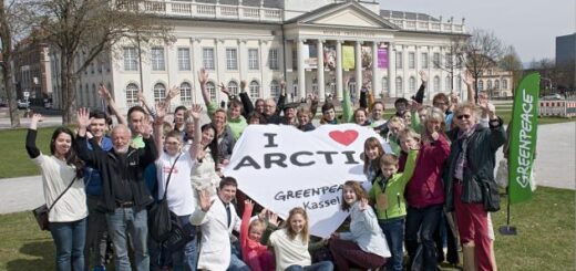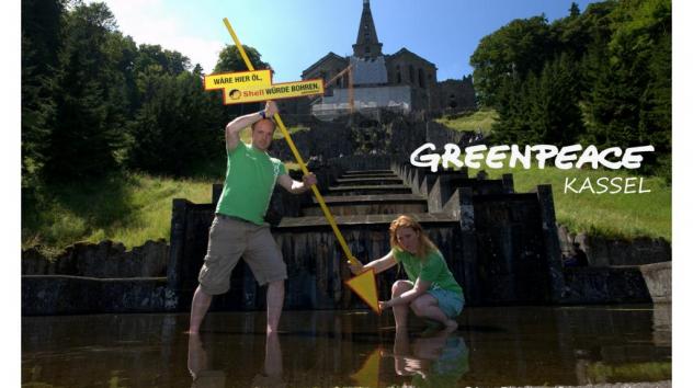 Am Samstag, 20.07.2013 protestierten wir an den Herkuleskaskaden gegen Shell. Im kürzlich zum Weltkulturerbe ernannten Bergpark markierten wir mit einem 2 m langen knallgelben Pfeil mehrere Stellen zwischen Herkules und Schloss Wilhelmshöhe und machten Passanten auf die Pläne des Konzerns aufmerksam, in der Arktis nach Öl zu bohren. Auf dem Pfeil steht: „Wäre hier Öl, Shell würde bohren! Mit unserer bundesweiten Aktion, die zeitgleich an Sehenswürdigkeiten in 50 deutschen Städten stattfand, machte Greenpeace deutlich, dass Shell keine Rücksicht nimmt und überall bohren würde, wenn es um Profite geht, also auch in Kassel. Ölunfälle sind an der Tagesordnung. Eine Katastrophe nach einem Ölunfall würde in der Arktis praktisch unabwendbar. Das Verbrennen von Öl beschleunigt den Klimawandel. Dadurch schwindet das arktische Meereis. Dieses reflektiert allerdings das Sonnenlicht. Schmilzt das Meereis weiter so rapide, erwärmt sich die Atmosphäre umso schneller. Ein Teufelskreis, der durchbrochen werden muss. Deshalb fordert Greenpeace einen Stopp der Ölbohrungen in der Arktis und ein internationales Schutzgebiet rund um den Nordpol.