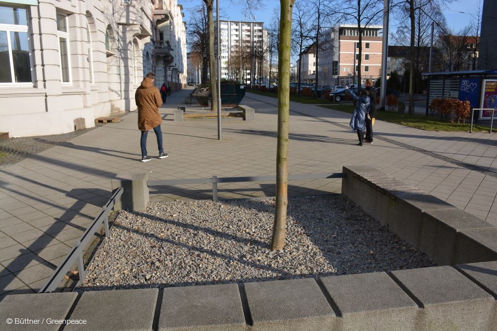 Aktive von Greenpeace Kassel haben sich auf die Spurensuche für mehr Grünflächen und Blühwiesen in Kassels Innenstadt gemacht. Besonders negativ sind ihnen dabei die Friedrich-Ebert-Straße und die Goethestraße aufgefallen. Nach deren Sanierung, sammelt sich um die 72 neu gepflanzten Amber-Bäumen in der Friedrich-Ebert-Straße Müll an und auch in der Goethestraße befinden sich 20 unbepflanzte und karge Baumscheiben. „Kein schöner Anblick für die Bürger und Bürgerinnen von Kassels Vorderen Westen“, sagt Alexander Büttner von Greenpeace Kassel. „Mit nur wenig finanziellen Mitteln und einem geringen Aufwand wäre es möglich, das Bild dieses Stadtteils noch schöner zu gestalten.“