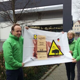 Seit Wochen konfrontieren wir Lidl damit, dass VerbraucherInnen bei der Eigenmarke Landjunker nicht nachvollziehen können, woher das frische Schweinefleisch eigentlich kommt und wie die Schweine gehalten wurden. Auch in Kassel standen wir mit...