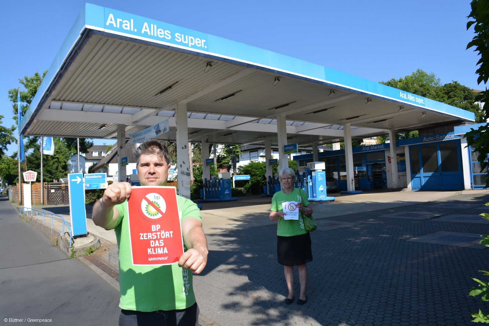 Greenpeace-Aktivisten protestieren in Kassel vor Aral-Tankstelle gegen Ölbohrungen in der Nordsee