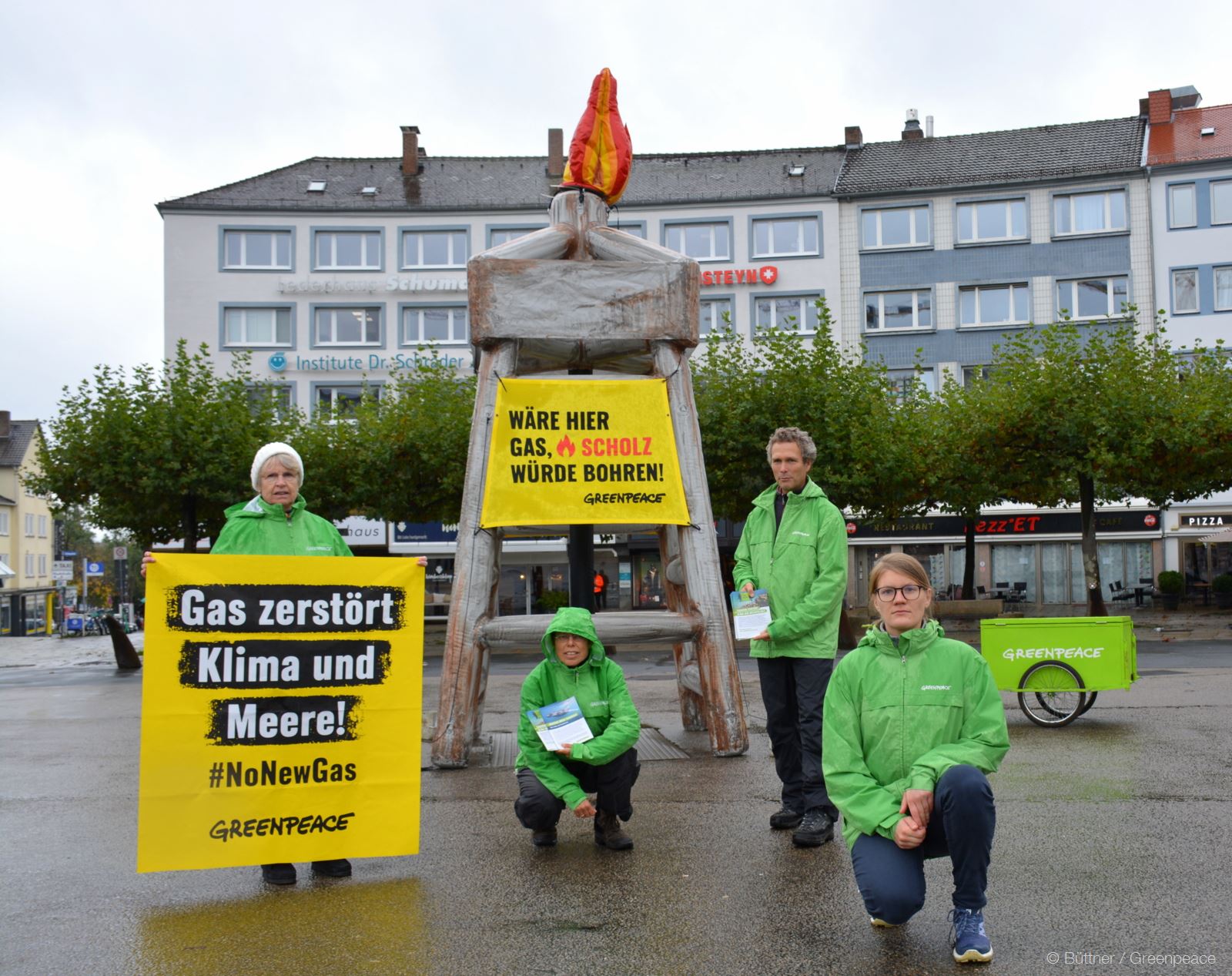 Mit einem rund fünf Meter hohen, aufblasbaren Bohrturm, an dem ein Banner mit der Aufschrift “Wäre hier Gas, Scholz würde bohren” hängt, fordern Greenpeace-Aktive auf dem Kasseler Königsplatz den Stopp neuer Gasprojekte, die von der deutschen Bundesregierung in Meeresgebieten vor Borkum und Rügen, aber auch vor der Westküste Australiens vorangetrieben werden.