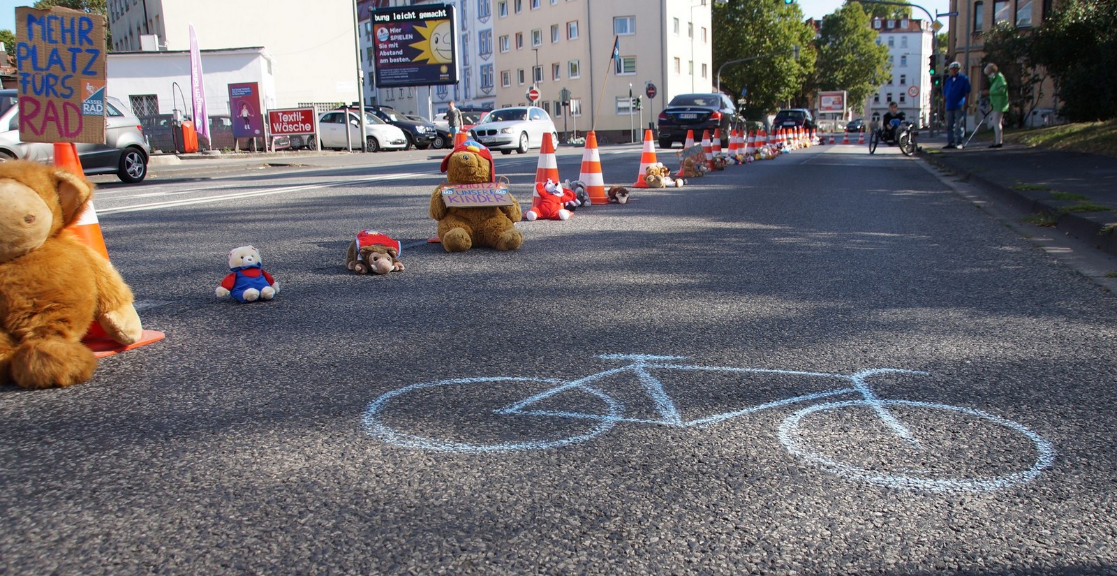 Bei schönstem Radfahr-Wetter startete die Fahrraddemo um 15:00 Uhr am Friedrichsplatz und bahnte sich, angeführt von den jüngsten Teilnehmenden, durch die Kasseler Innenstadt Richtung Unterneustadt bis zum Dorfplatz in Bettenhausen. Das Highlight der rund 7 km langen Radstrecke war die „Teddy-Pop-Up-Bike-Lane“ in der Ysenburgstraße. Hier konnten die Kinder auf einer temporär als Radweg genutzte Straßenspur, gesäumt von Teddybären, fahren.